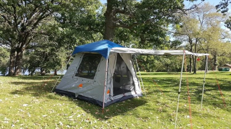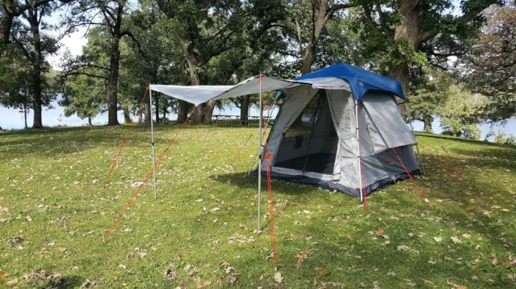 Expand your Oxley 5 Lite tent living space with an attached front awning for shade or enclose the space under the awning by zipping on a one piece complete panel set that offers you privacy or by having the screens exposed for full ventillation.